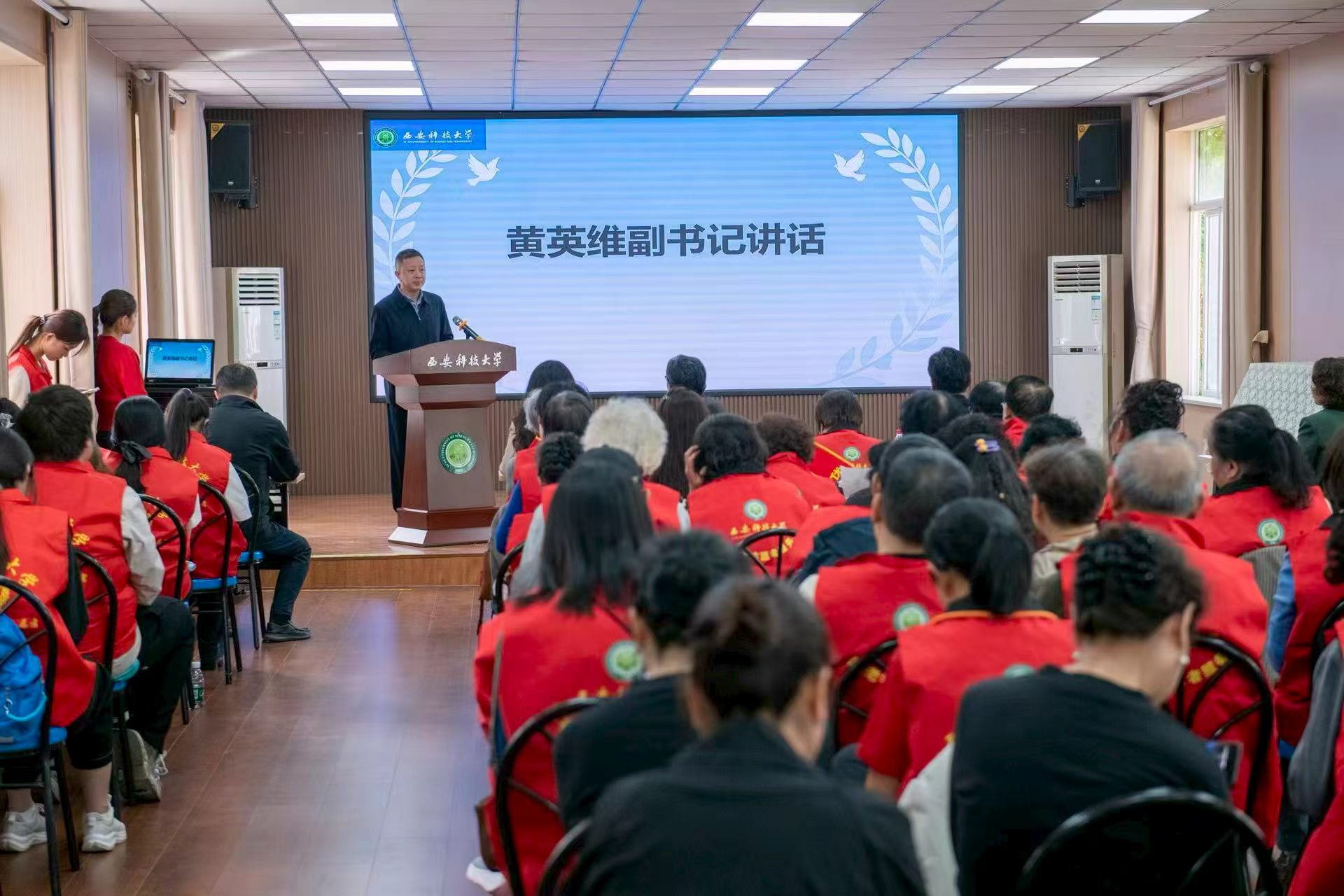 为深入贯彻落实党的二十大和二十届历次全会精神,积极培育和践行社会主义核心价值观,4月23日下午,西安科技大学2026年“暖心陪伴年”志愿服务活动启动仪式在雁塔校区离退处三楼多功能厅举行。校党委副书记黄英维出席仪式并讲话。校工会、校团委、离退处负责人,胡杨老年志愿者代表、胡杨青年志愿者代表及离退休社团代表等约80人参加活动。仪式由离退休党委负责人主持。